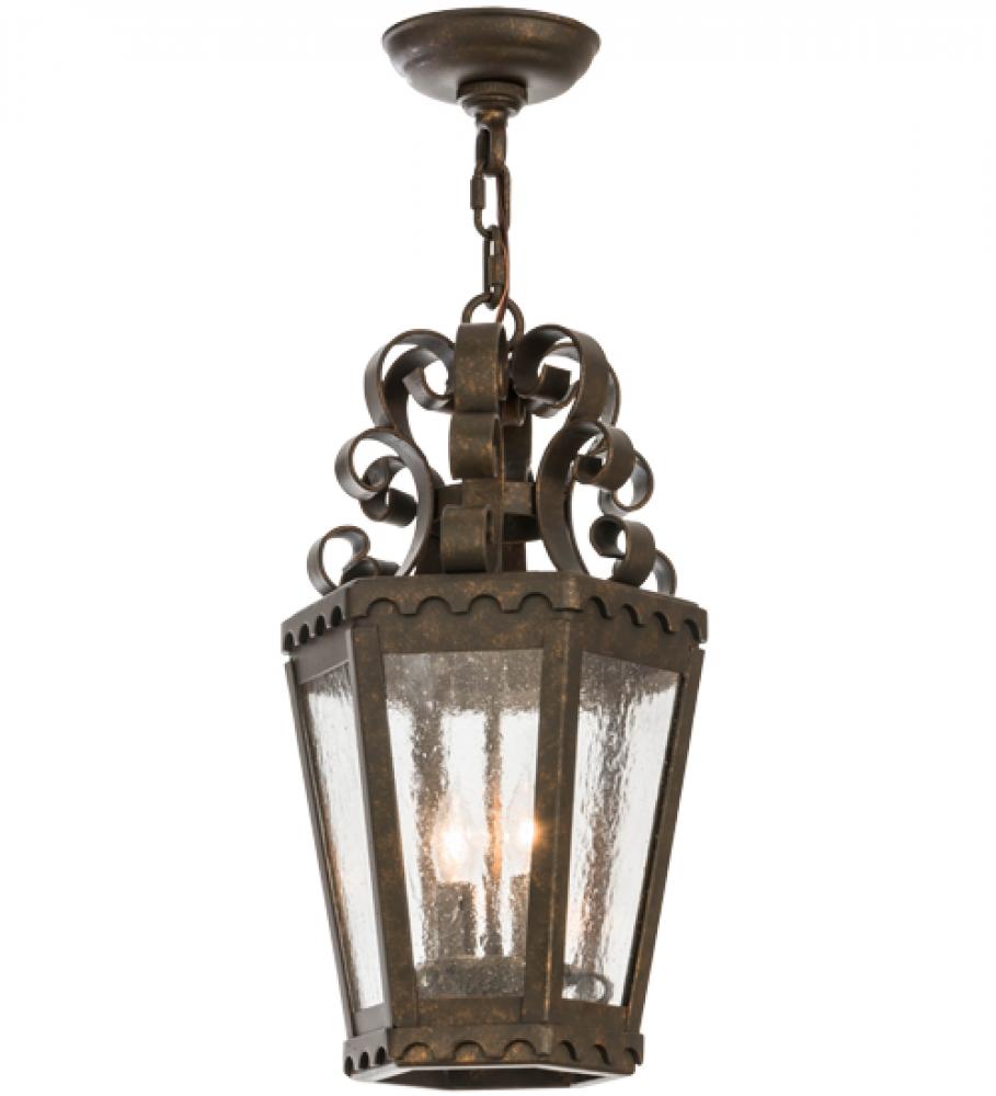 The sophisticated Cadenza lantern is designed with elaborate scroll details and brilliant elegance. Custom crafted of Hand-forged iron with a hand-applied Gilded Tobacco finish and complemented with 6 panels of Clear Seeded Glass. Designed with high-style appeal, the fixtures are used for beautiful ambient lighting in corridors, porches, entryways and other residential and commercial spaces. Custom designs, sizes and finishes are available, as well as dimmable energy efficient lamping options such as LED. The 10-inch wide pendant is UL and cUL listed for dry and damp locations.