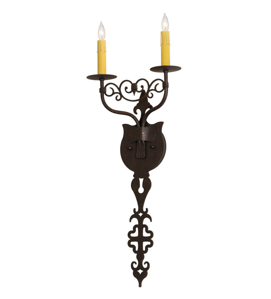 Ornate Hand-forged Iron Scrollwork and a medallion styled backplate create a rich, luxurious look for Merano. This high-styled wall fixture features two Ivory faux candlelights perched on bobeches and enhanced with a Gilded Tobacco finish. This ADA Compliant wall sconce is ideal to complement a variety of architectural styles for today's interiors. Custom crafted by highly skilled artisans in our 180,000 square foot manufacturing facility in Yorkville, New York. Candlelight colors, metal finishes and pendant sizes can be customized. UL and cUL listed for dry and damp locations.