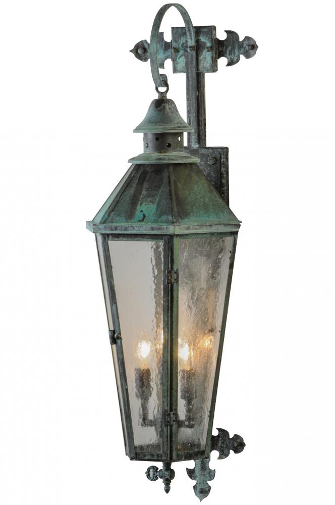 Grand stature and exquisite metalwork are combined to create a sophisticated, luxurious look for Millesime. This high-styled wall fixture features Clear Seeded glass, which is enhanced with Solid Brass hardware with distinctive accents featured in a stunning Craftsman Verdi finish. Three candelabra lamps, which are handpainted to match the hardware, provide ambient illumination from within the lantern. This sconce is ideal to complement a variety of architectural styles for today's fine exteriors and interiors, including hallways, foyers, entryways and other spaces in residential, hospitality and other commercial settings. Custom crafted in the USA, this fixture is offered with options. UL and cUL listed for dry, damp and wet locations.