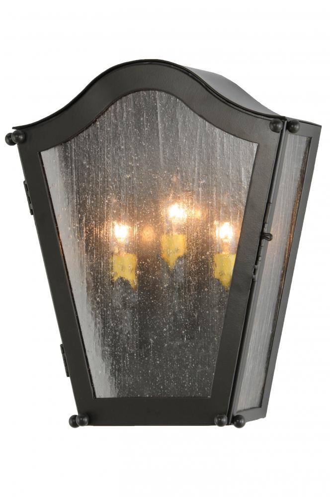 A lovely curvaceous lantern wall sconce, Austin features Clear Seeded Glass that reveals three handpainted Acanthus leaf accented candle covers with Customer-supplied candelabra lamps. The graceful frame and hardware are offered in a stunning Timeless Bronze finish. Handcrafted by highly skilled artisans in our manufacturing facility in Yorkville, NY, this wall sconce is available in custom shapes, designs, colors and sizes. Dimmable energy efficient lamping options such as LED are offered. The 14-inch tall fixture is UL and cUL listed for dry, damp and wet locations.