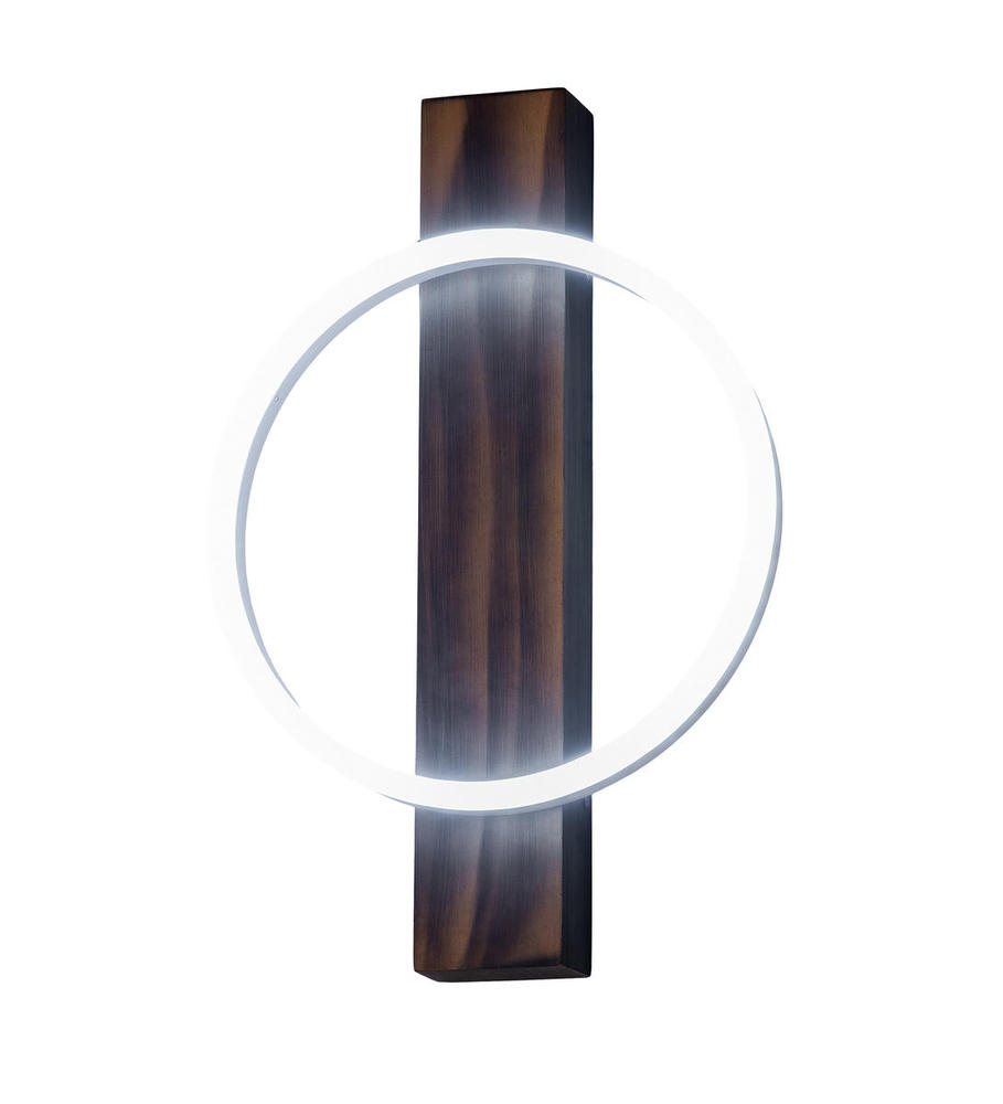 A stunning modern ring is combined with a handsome rustic look. A brilliant illuminating Statuario Idalight Halo is embraced by a Wooden backplate with a Satin Wood finish. Integral LEDs deliver energy efficient illumination and long lamp life. Custom crafted by highly skilled artisans in our 180,000 sq ft manufacturing facility in Yorkville, NY at the foothills of the Adirondack Mountains. Customize fixture sizes, metal finishes and diffuser colors to your tastes. UL and cUL listed for dry and damp locations.