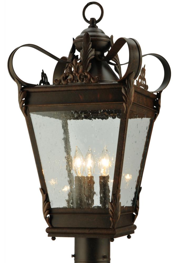 Acanthus leaves, decorative accents and hand forged Iron Scrollwork in a Gilded Tobacco Finish highlight this regal looking lantern. This stately post mount features a Clear Seeded Glass that reveals three complementary faux candle lights. Ideal for indoor and outdoor lighting applications. The Verona can be mounted directly on to posts or decorative columns. Custom crafted by highly skilled artisans in our 180,000 square foot manufacturing facility in Yorkville, NY. Custom sizes and finishes are available. Dimmable energy efficient lamping options offered. UL and cUL listed for dry, damp and wet locations.
