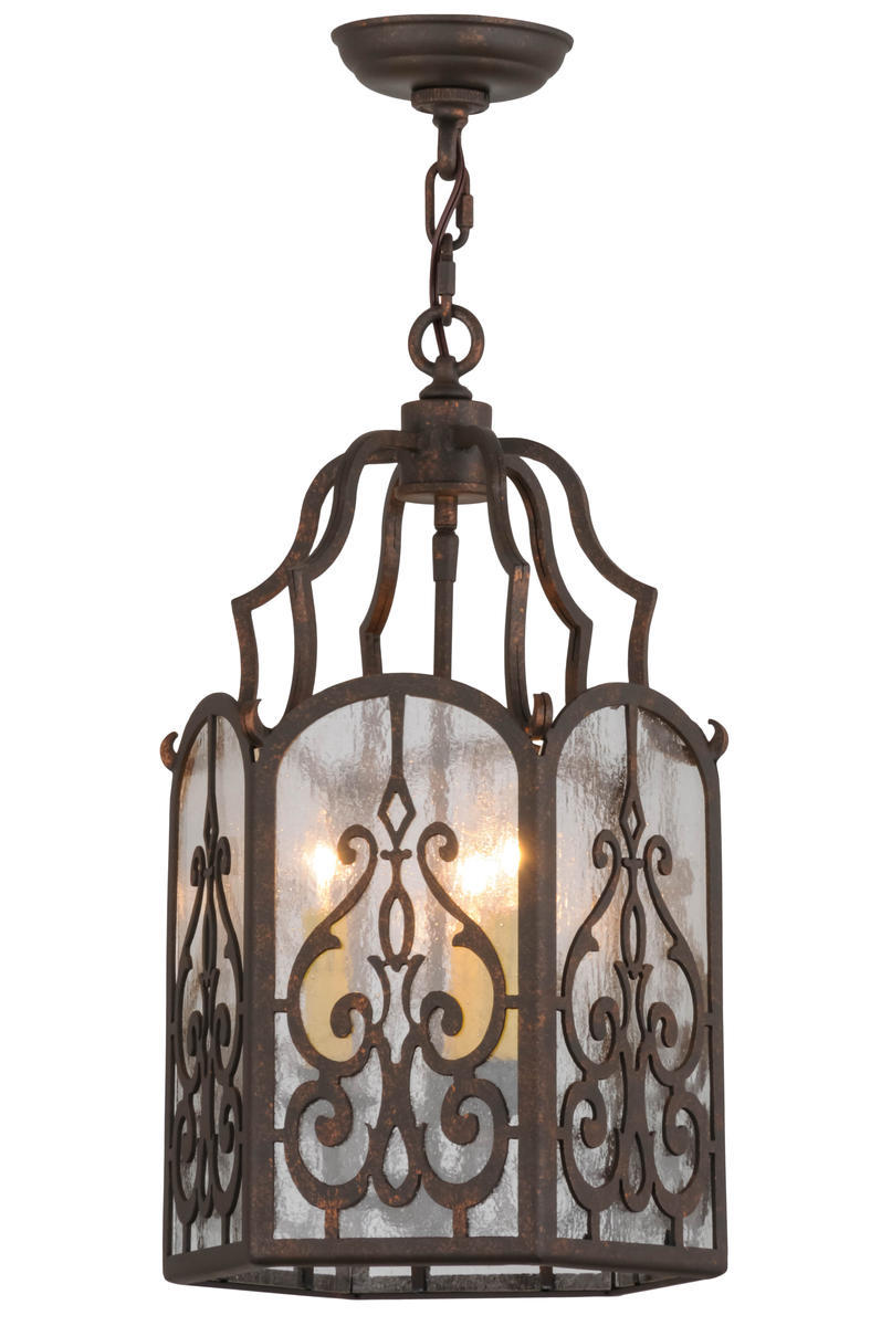 An exquisite pendant for a variety of settings, Antencio achieves a new level of quality and attention to detail with an intricate design and Clear Seeded glass that nearly conceals the three-light faux candelabra inside the diffuser. The pendant is designed with a decorative frame and hardware featured in a warm Gilded Tobacco finish. Fixture is custom crafted by skillful artisans in our 180,000 square foot manufacturing facility in Yorkville, New York. Dimmable energy efficient lamping options such as LED, as well as custom sizes, styles and colors, are available. The pendant is UL and cUL listed for damp and dry locations.