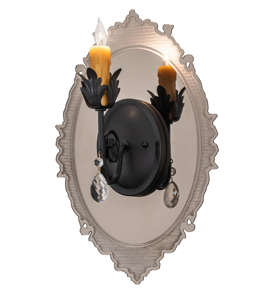 Exquisite styling and luxurious charm are reflected in the Antonia mirror wall sconce. An Amber faux candlelight is embraced by an Acanthus leaf accented bobeche with a faceted Crystal Pendalog. The Solar Black finished wall plate is attached to a delicately etched antique style mirror. Custom crafted by highly skilled artisans in our 180,000 square foot manufacturing facility in Yorkville, New York. Custom mirrors, candlelights, metal finishes and fixture sizes are available. UL and cUL listed for damp and dry locations.