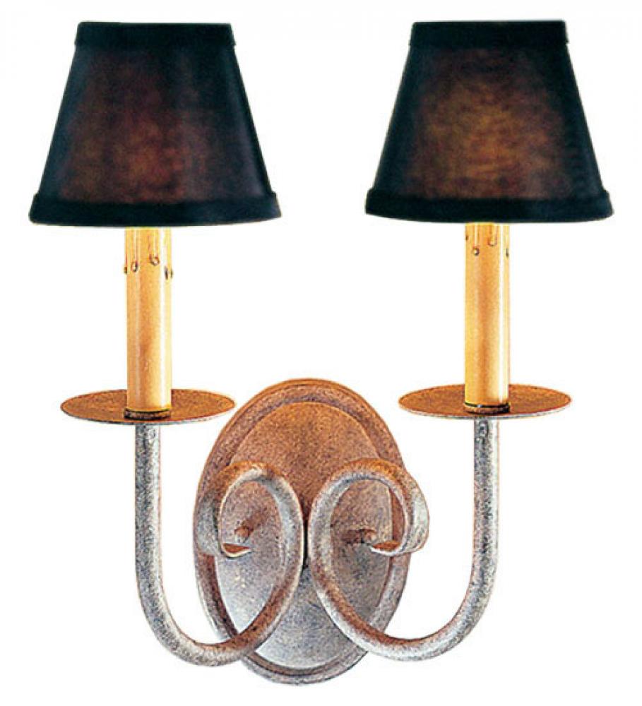 Elegant European lighting fixtures from castles were the inspiration for Squire's silhouette design, employing Hand-Forge Iron scrolled arms and contoured supports to define its graceful profile. 2 Ivory faux candlelights crowned with Textrene Shades perched on saucer-like bobeches add a lovely touch to this fixture, which is featured in a Pate hand applied finish. Handcrafted by highly skilled artisans in Central New York, this lovely wall sconce is available in custom sizes, styles, finishes and dimmable energy efficient lamping options such as LED. The exquisite wall fixture, which is nearly 13 inches wide and nearly 15 inches tall, is UL and cUL listed for damp and dry locations.