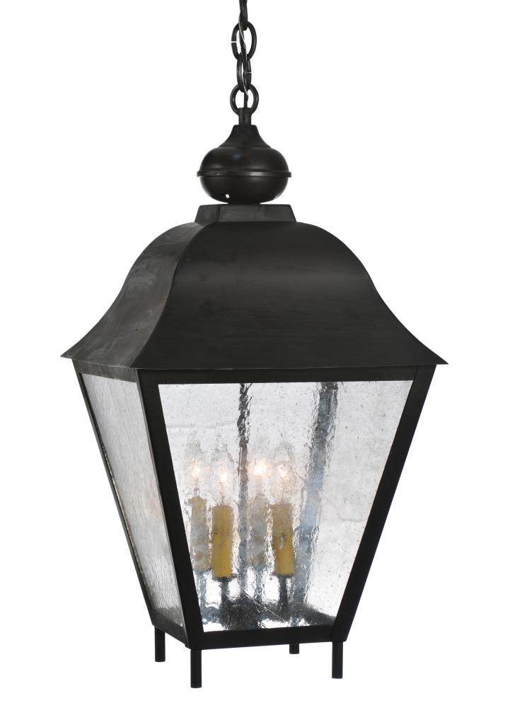 Grace your home or business with the traditional elegance of this Boston Indoor/Outdoor Post Lantern. This handsome lantern will add character and authenticity to any residential, hospitality or commercial setting. A Wrought Iron frame and Hand-Forged Iron Scrollwork are complemented with a Clear Seeded Glass Lens that reveals 4 Ivory faux candlelights. The overall height ranges from 29 to 59 inches as the chain length can be easily adjusted in the field to accommodate your specific lighting application needs. The lantern is handcrafted in our 180,000 square foot manufacturing facility in Yorkville, New York. Lantern styles, metal finishes and fixture sizes can be customized to your needs. UL and cUL listed for dry, damp and wet locations.