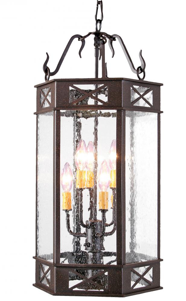 Welcome a handsome revival look into your home or business with the stunning Gina Pendant, which integrates a distinctive motif with classic styling. 7 Amber faux candlelights are revealed inside the Clear Seeded Glass shade which is complemented with a Hand Forged Iron frame and hardware in a stunning Cajun Spice finish. The fixture completes an evocative impression with a compelling design and beautiful ambient illumination. Custom crafted in Yorkville, New York by highly skilled artisans, this fixture is available in custom finishes, sizes and colors, as well as dimmable energy efficient lamping options. The pendant is UL and cUL listed for damp and dry locations.