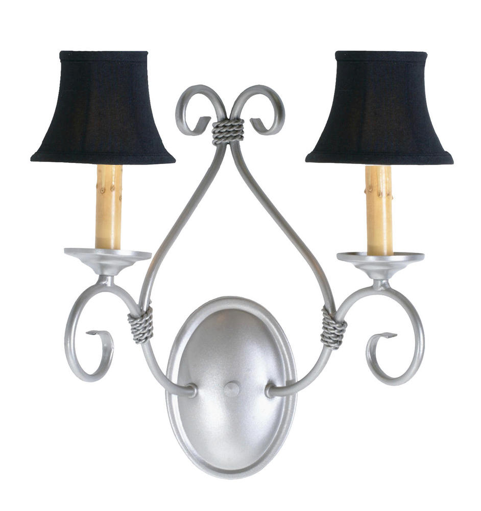 A rich exquisite look is defined by the Olivia Wall Sconce. Two graceful faux candlelights with Amber candle covers crowned with Black Textrene shades adorn bobeches with ornate, scroll-like hardware featured in a stunning Pewter hand-applied finish.? This fixture is custom crafted by our artisans in the USA. Custom lighting fixtures are offered with multiple candlelights as well, and in a variety of finishes, styles and energy efficient lamping options such as LED. The nearly 14-inch wide wall sconce is UL and cUL listed for dry and damp locations.