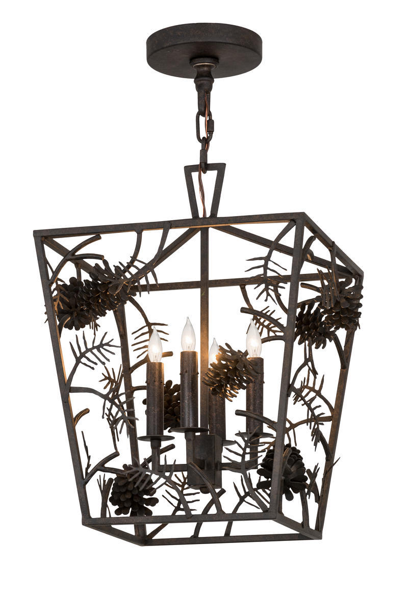 A sophisticated architecturally styled fixture is combined with a rustic nature inspired design. Give your decor an extra edge with this breathtaking pendant, which is highlighted with a Chestnut-finished structure that encases four faux candlelights perched on bobeches. Exquisite steel pinecones with pine needles accent each side of this unique pendant. Handmade in our 180,000 square foot manufacturing facility in Yorkville, New York. Available in custom sizes, styles and finishes, as well as dimmable energy efficient lamping options. UL and CUL listed for damp and dry locations.