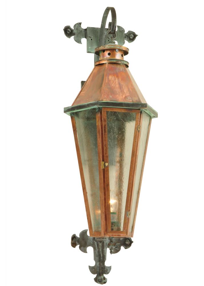 Custom crafted of Solid Copper and Brass, grand stature and exquisite metalwork are combined to create a sophisticated, luxurious look for Millesime. This high-styled wall fixture features Clear Seeded glass, which is enhanced with Solid Brass hardware which is complemented with a distinctive combination of Raw Copper and Verdi Brass finishes. A single faux candlelight provides ambient illumination from within the lantern. This sconce operates with a photocell sensor that automatically turns the light on at dusk and off at dawn. Handmade in our 180,000 manufacturing facility in the USA. Custom options available. UL and cUL listed for dry, damp and wet locations.