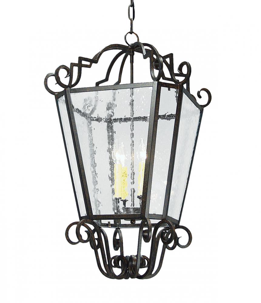 An exquisite pendant for a variety of home, hospitality and commercial settings, the Clear Seeded Glass lens reveals an Ivory 4-light faux candelabrum for brilliant ambient illumination. Gilded Tobacco finished scrollwork with matching frame and hardware provide a graceful elegant look and attention to detail. The decorative fixture, which is perfect to welcome guests as a foyer or entryway luminaire or a centerpiece in any room, is custom crafted by artisans using time-honored artisanship in Upstate New York in the USA. Dimmable energy efficient lamping options such as LED, as well as custom sizes, styles and colors, are available. The 15-inch wide lantern is UL and cUL listed for damp and dry locations.