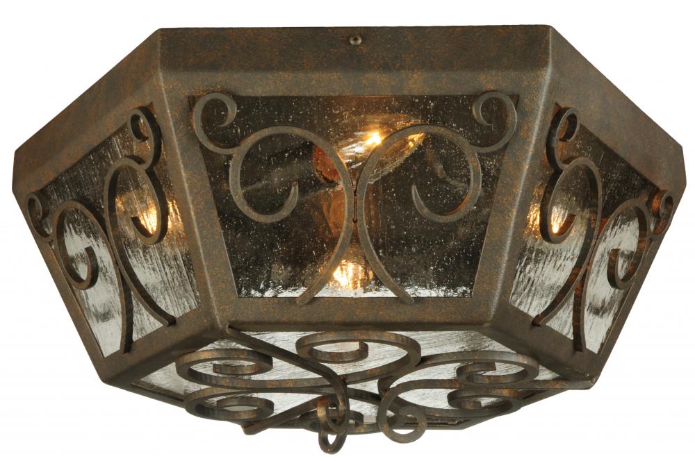 Defined by a Hand-Forged Iron scrollwork design on all sides and bottom panel of this hexagon shaped ceiling fixture. Camilla features Clear Seeded glass with a Copper Rust finish. Handcrafted by highly skilled artisans in our 180,000 square foot manufacturing facility in Yorkville, New York. Diffuser colors, metal finishes and fixture sizes can be customized to your needs. UL and cUL listed for dry and damp locations.