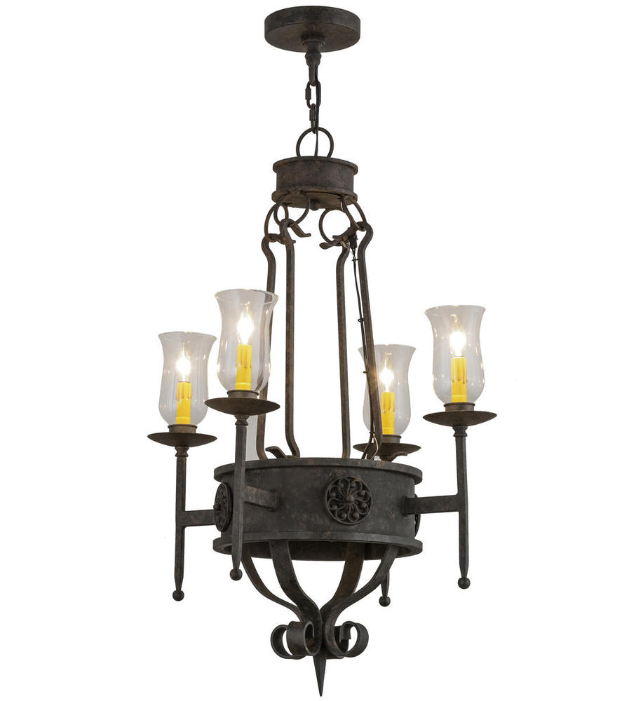 Integrating a rich charm and artistic look, the Lorenzo steel chandelier features floral medallions and is adorned with 4 Clear Hurricane Glass shades revealing Ivory faux candlelights perched on bobeches with long ballpoint arms. The fixture is enhanced with hand forged hardware and a scrolled finial featured in a warm Coffee Bean finish. The fixture is ideal for entryways, dining areas, lobbies and other rooms in a variety of residential and commercial settings. The chandelier is handcrafted by highly skilled artisans in the USA. Options include dimmable energy efficient lamping, as well as custom sizes, styles and colors. The fixture is UL and cUL listed for damp and dry locations.