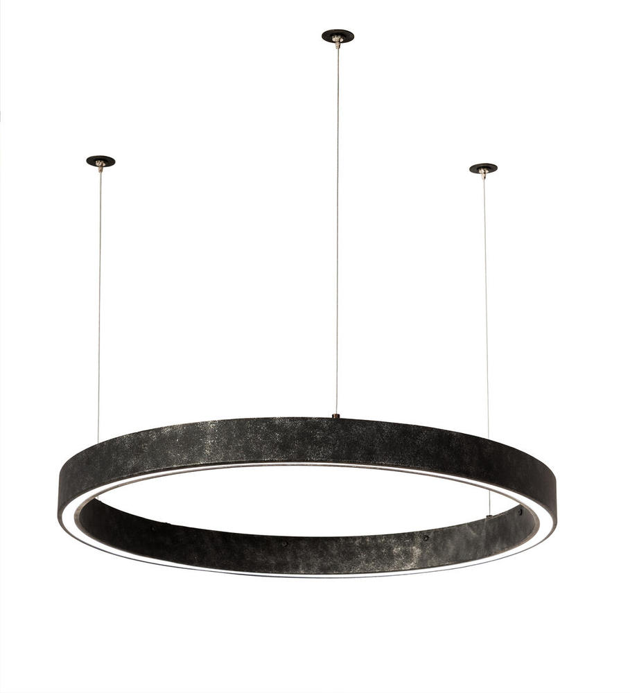 A modern sophisticated pendant featuring a spectral halo of ambient light. Eliminating the power cord, our exclusive proprietary suspension system is engineered with low voltage spacecraft cables for balance and precision. This Gunmetal finished ring reveals a Statuario Idalight diffuser. Integral LEDs deliver dimmable, robust illumination, energy savings, minimal maintenance and long life. The overall height ranges from 4 to 108 inches as the chain length can be easily adjusted in the field to accommodate your specific lighting application needs. Handcrafted in our 180,000 square foot manufacturing facility in Yorkville, New York. Available in a wide range of custom choices including various finishes and sizes.