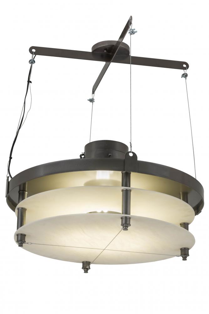 Energized by inventions that advocate reason, capitalism and individualism, Atlantis takes a contemporary approach to an industrial design. This pendant deploys thick layers of Creme Carrare Idalight halos with a Satin finish, connected with columns and hardware that are featured in a Bronze Metallic finish. Wire suspensions provide additional support and a decorative touch. The fixture is custom crafted in the USA with customer-supplied energy efficient compact fluorescent lamps for 120-277v lighting systems. Custom colors, styles, sizes and other dimmable energy efficient lamping options are available. UL and cUL listed for damp and dry locations.
