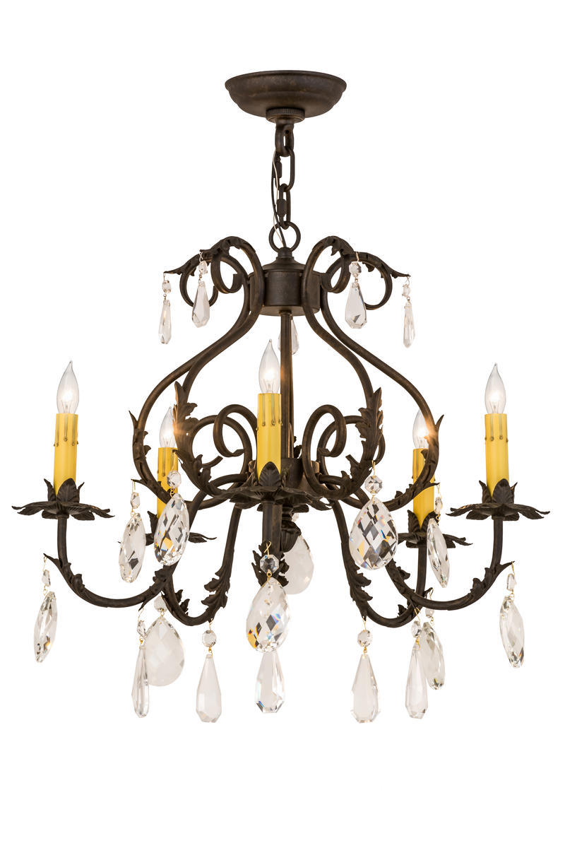 An elegant chandelier design comes to light with sparkle and glamour. 5 Amber faux candlelights are perched on floral bobeches which are embraced by exquisite curved arms featured in a Chestnut finish. Matching Acanthus leaves, crystal droplets and scrolls grace this lovely fixture. The overall height ranges from 26 to 74 inches as the chain length can be easily adjusted in the field to accommodate your specific lighting application needs. Handcrafted in our 180,000 square foot manufacturing facility in Yorkville, New York. Custom options include special sizes, diffuser colors and finishes. UL and cUL listed for damp and dry locations.