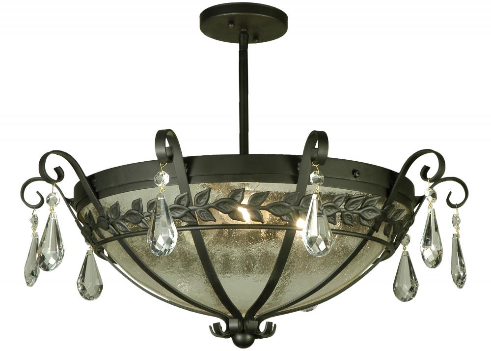 A nature inspired motif is combined with crystal elegance. A border of delicate petals accent the perimeter of this Rainstone Idalight shade which is accented with Crystal Pendalogs, Scrolled Arms and a complementary finial in a Blackwash finish. Handmade in our manufacturing facility in Yorkville, NY, this ceiling fixture is offered in custom colors, styles and sizes. Dimmable energy efficient lamping options such as LED are available. The 24-inch wide fixture is UL and cUL listed for dry and damp locations.