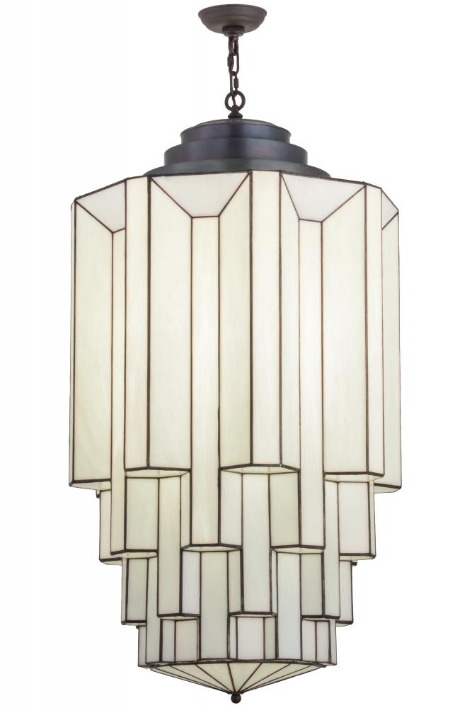 Designed with the glitz and glam of old fashioned movie theaters, Paramount evokes a romantic illusion with a dramatic lighting design that features art glass created using our famous copperfoil construction. Multi layers and levels of enclosed glass cylinders create an extraordinary dimensional effect. A three step hub, featured in an Antique Iron Gate finish, crowns the shade. Handcrafted in the USA, this fixture is offered in custom sizes, styles and colors. UL and cUL listed for dry and damp locations.