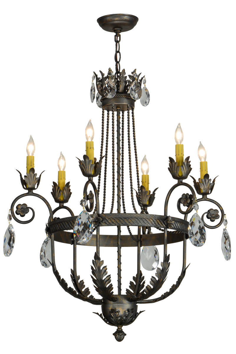 Exquisite styling and luxurious charm are reflected in the Antonia Chandelier, which is adorned with 6 Amber faux candlelights perched on floral bobeches with scrolled arms. The lush decorative accents, including Acanthus leaves, frame and Hand-forged Iron hardware are featured in a French Bronze finish and enhanced with Crystal droplet accents. The fixture features quality materials and hand detailed American craftsmanship perfected by years of time honored artistry, passed down from generations of highly skilled artisans. Custom sizes, styles, colors and dimmable energy efficient lamping options such as LED are available. The fixture is UL and cUL listed for damp and dry locations.