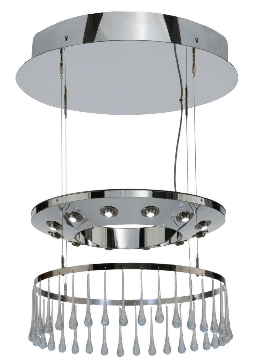 A modern, futuristic motif, this eye-catching chandelier embraces 36 Elongated Crystal droplets which are complemented with hardware and frame in a Mirror Aluminum finish. Handcrafted by highly skilled artisans in our 180,000 manufacturing facility in Yorkville, New York. This fixture is available in custom sizes, styles, and colors. Dimmable energy efficient lamping option options such as LED are available. The 26-inch wide fixture is UL and cUL listed for damp and dry locations.