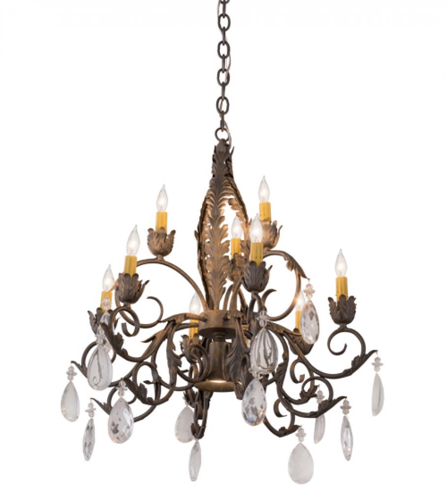 A luxurious elegance and romantic charm are captured by this Country French inspired Chandelier design. 10 Amber faux candlelights topped with Cream Textrene shades are embraced by floral bobeches with the curved arms of this decorative frame. The frame, scrollwork and hardware are detailed with bold scrolls and intricately carved acanthus leaves hand finished in a French Bronze hue. Large Crystal Pendalogs also accent this lovely chandelier. Custom colors, styles and sizes are available, as well dimmable energy efficient lamping options such as LED. The 26-inch wide fixture is UL and cUL listed for damp and dry locations.