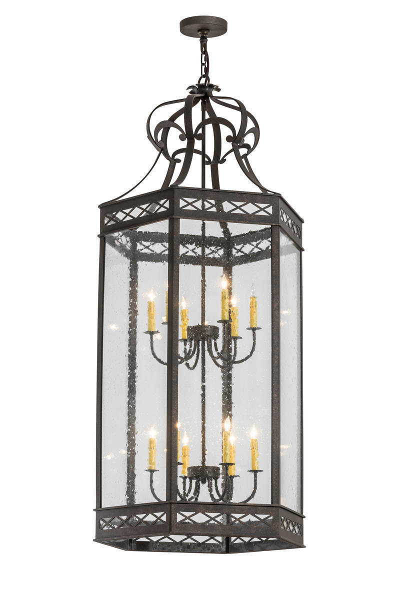 Enhance your interior space with handcrafted warmth and welcoming illumination as this striking pendant integrates lattice designed borders on Clear Seeded Glass, which reveals two faux six-light candelabras within and decorative accents and hardware featured in a handsome Gilded Tobacco finish. Custom crafted in the USA, this fixture is available in custom sizes, styles, colors and dimmable energy efficient lamping options such as LED. This pendant is UL and cUL listed for damp and dry locations.