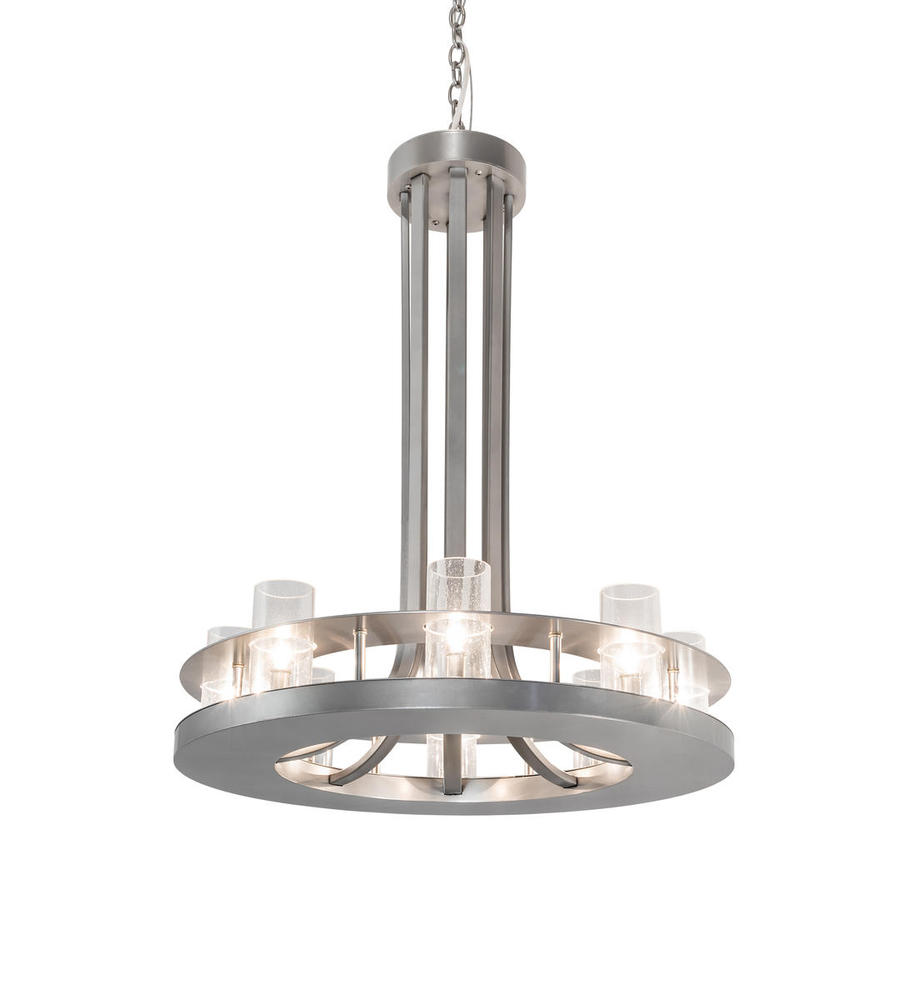 Created with a modern industrial look. The Arion Pendant features a sturdy ring that beholds 8 Clear Seeded Glass Cylindres. The handsome hardware is featured in a Nickel finish. The overall height ranges from 41 to 148 inches as the chain length can be easily adjusted in the field to accommodate your specific lighting application needs. Handcrafted by master artisans in our 180,000 square foot manufacturing facility in Yorkville, New York. Shade colors, metal finishes and sizes can be customized to meet your needs. UL and cUL listed for dry and damp locations.