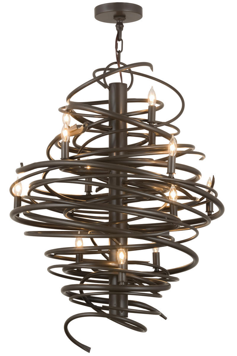 The popular Cyclone simulates whirling winds of energy and gyration with twisting Solid Steel tubing that is accentuated with 12 strategically placed faux candlelights. The winding mass of steel surrounds a sturdy post, all finished in Timeless Bronze. This chandelier is handcrafted by highly skilled artisans in our 180,000 square foot manufacturing facility in Yorkville, New York. This fixture is available in a wide range of custom choices including various designs, colors, sizes and dimmable energy efficient lamping options such as LED. UL and cUL listed for damp and dry locations.