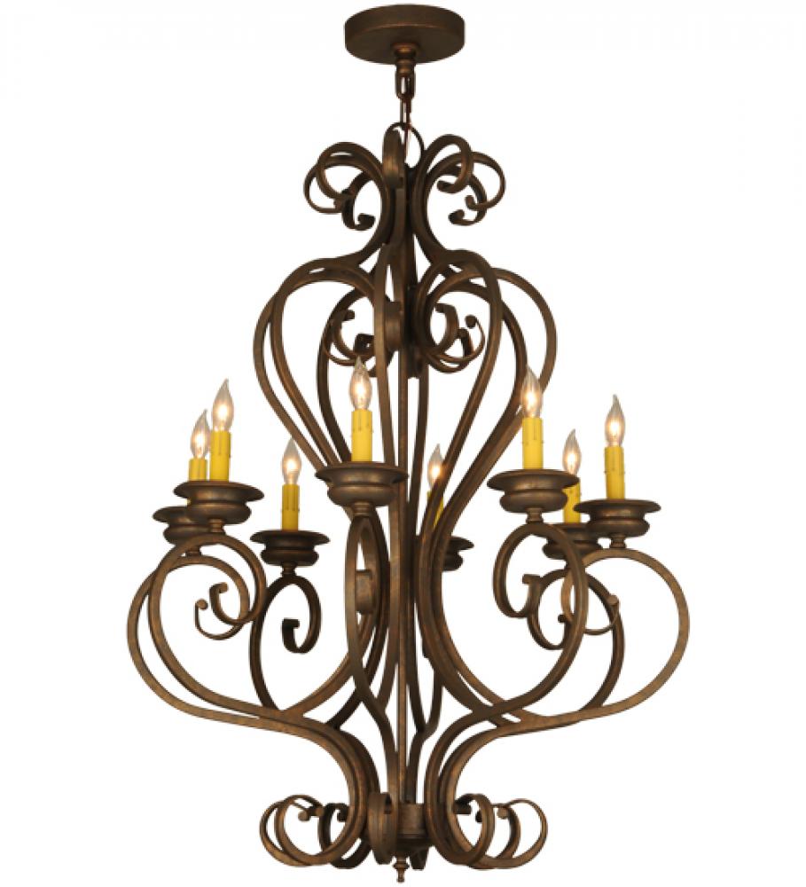 Beauty and grace come to light with this elegant chandelier highlighted with an elaborate scroll design. 8 Amber faux candlelights are perched on distinctive bobeches featured in a tasteful French Bronze finish. Perfect to illuminate nearly any room in fine homes, hotels, restaurants and other residential and commercial spaces. This classic decorative lighting fixture complements any interior design. Handcrafted in our manufacturing facilities in the USA, Fernando is available in a variety of custom sizes, finishes and dimmable energy efficient lamping options such as LED. The 28-inch wide chandelier is UL and cUL listed for damp and dry locations.