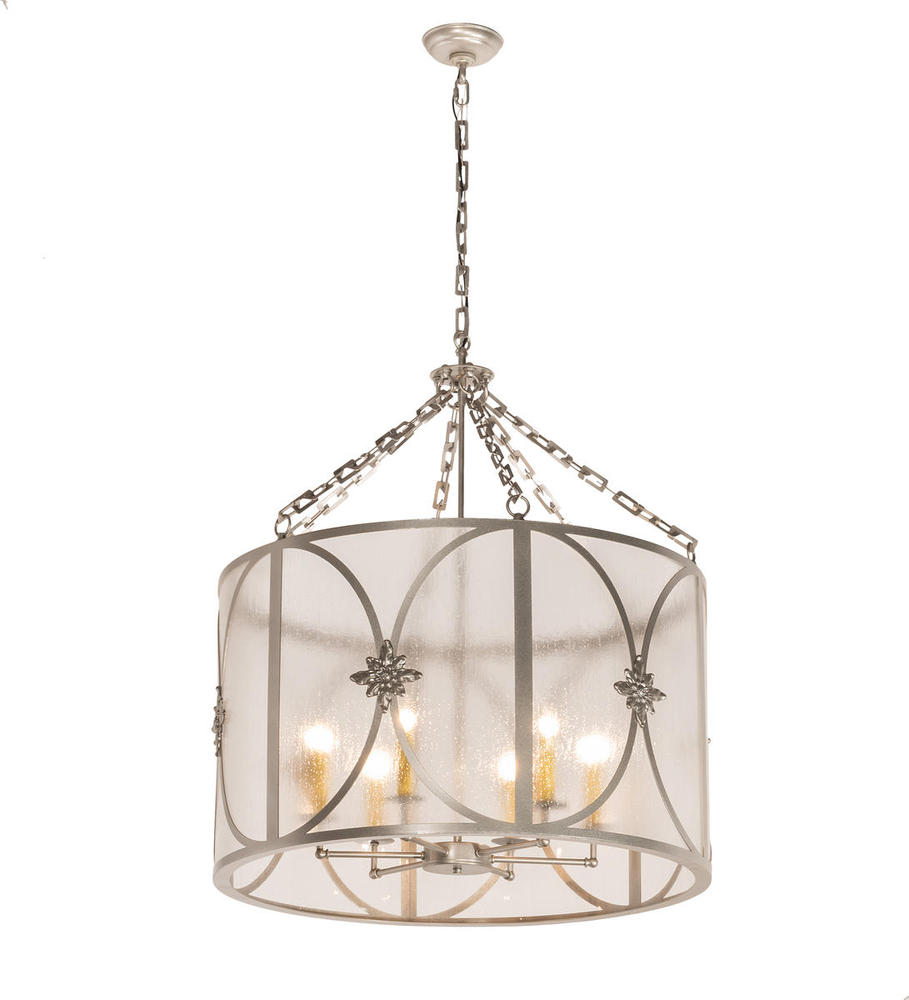 Superb American craftsmanship creates the beauty of fine lighting with the elegant Penelope pendant. A circular frame features a Rainstone Idalight diffuser which reveals six Ivory colored faux candlelights. The fixture is a Light Sandstone finish and complemented with floral accents. The overall height ranges from 39 to 110 inches as the chain length can be easily adjusted in the field to accommodate your specific lighting application needs. Custom crafted by highly skilled artisans in our 180,000 square foot manufacturing facility in Yorkville, New York. Shade styles, metal finishes and pendant sizes can be customized. UL and cUL listed for dry and damp locations.