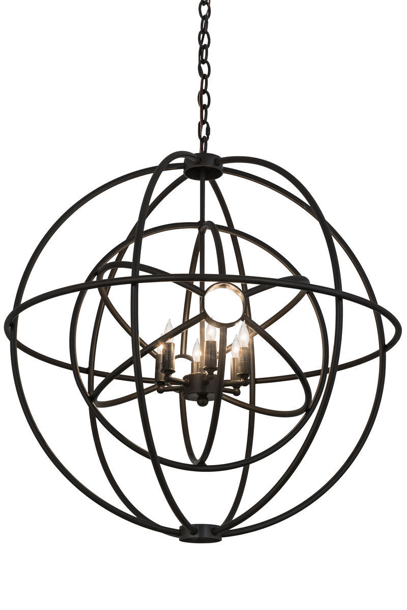 Like a complex gyroscopic structure, Timeless Bronze finished steel rings create a unique curvature pattern that evokes the illusion of revolutionary motion like a spinning gimbal rotating on its axis. The orbed frame envelopes a smaller frame similar to one that represents atomic energy, which wraps around an elegant Amber-colored faux 6-light candelabra. Custom crafted in the USA, this fixture is available in custom colors, designs and sizes, as well as dimmable energy efficient lamping options such as LED. The chandelier is UL and  cUL listed for damp and dry locations.