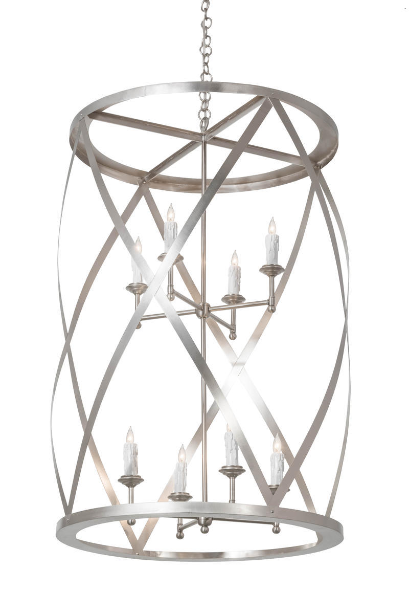 Geometric diamond patterns are revealed by a spiraling frame that encircles two 4-light faux candelabras.The Solid Brass frame and matching hardware are featured in a lustrous Brushed Nickel finish.Handmade in the USA, custom sizes, styles and finishes are available, as well as dimmable energy efficient lamping options such as LED. The pendant is UL and cUL listed for damp and dry locations.