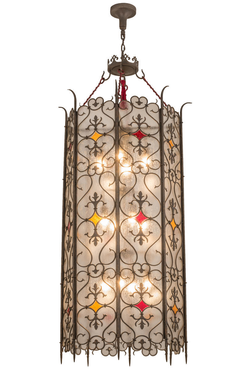 Applying a creative heritage and distinguished pedigree to render fine decorative lighting, impeccable attention to detail in design comes to light with the Saskia pendant. This exquisite, attention-getting fixture features an elaborate scrolled metallic design accented with Ruby and Topaz art glass diamonds on Rainstone Idalight. The complex pattern delineates metallic scrolls and floral motifs with scalloped edges and curved pinnacles towered by a decorative crown. Handcrafted by highly skilled artisans in our 180,000 square foot manufacturing facility in Yorkville, New York. Options include custom sizes, styles and colors. UL and cUL listed for damp and dry locations.