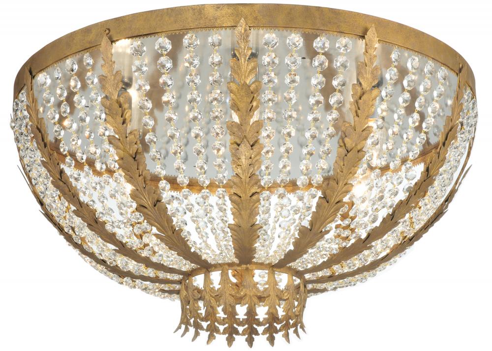 Bejeweled with lovely garlands of faceted crystal beads that emanate brilliant radiance and luxury for any setting. This elegant ceiling fixture features a Pompeii Gold finish and is adorned with Acanthus leaf accents. Custom crafted in our 180,000 square foot manufacturing facility in Yorkville, New York. Metal finishes, crystal designs and fixture sizes can be customized to meet your lighting needs. UL and cUL listed for dry and damp locations.