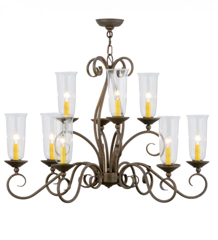 Romantic charm and elegance come to light with the Wallis chandelier, which features 10 Clear Glass Hurricane shades that reveal Amber faux candlelights, perched on bobeches attached to scroll designed arms. The hand forged hardware, frame and accents are highlighted in a Gilded Tobacco finish. Handcrafted by highly skilled artisans in our Upstate New York manufacturing facility, this fixture is available in custom sizes, styles, colors and energy efficient lamping options such as LED. This chandelier is UL and cUL listed for damp and dry locations.