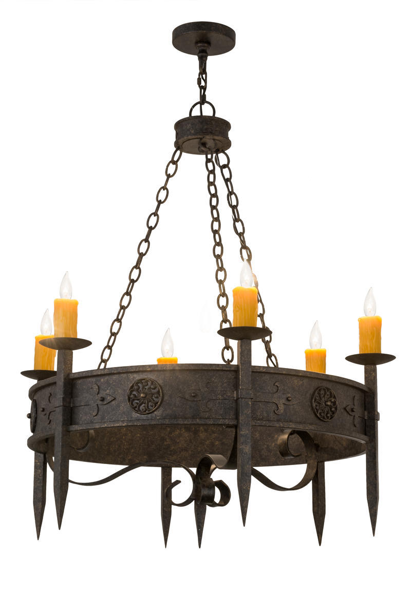 Calandara integrates a rich charm and artistic look. Floral medallions accentuate this stunning steel chandelier, which is adorned with six exquisite faux candlelights perched on bobeches with Gothic styled spears. The fixture is enhanced with sturdy, detailed hardware and a scrolled finial featured in a handsome Golden Bronze finish. The fixture is ideal for entryways, dining areas, and other rooms in a variety of residential and commercial settings. The chandelier is handcrafted by our artisans in the USA. Options include dimmable energy efficient lamping, as well as custom sizes, styles and colors. The fixture is UL and cUL listed for damp and dry locations.