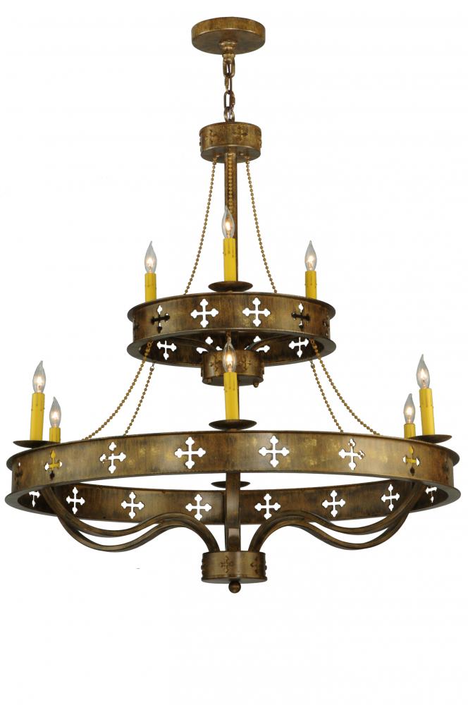 Stylized Byzantine Cross insignias adorn the rugged rings of this classic ceiling fixture. These two luxurious rings are handcrafted of Brushed Gold finished metal hardware, along with wave-like arms and ballpoint accent on bottom, to blend with nearly any interior decor. 9 Amber faux candlelights provide beautiful ambient illumination. The fixture, which includes a matching beaded garland, is perfect as the centerpiece for living spaces, foyers, conference rooms, lobbies and other spaces. Handmade by highly skilled artisans in the USA. Custom sizes, designs, finishes and dimmable lamping options such as LED are available. This Gothic influenced chandelier, which is nearly 38 inches wide, is UL and CUL listed dry and damp locations.