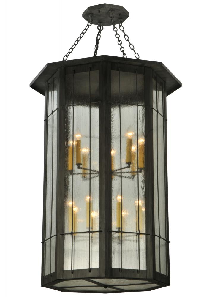 The West Albany Pendant displays an Octagon shaped lantern featuring Clear Seeded Glass panels that reveal 2 8-light faux candelabras. The hardware and frame are offered in an Antique Iron Gate finish. Handcrafted by highly skilled artisans in our 180,000 square foot manufacturing facility in Yorkville, New York, this lovely fixture is offered in custom sizes, styles and colors, as well as dimmable energy efficient lamping options such as LED. The pendant is UL and cUL listed for dry and damp locations.