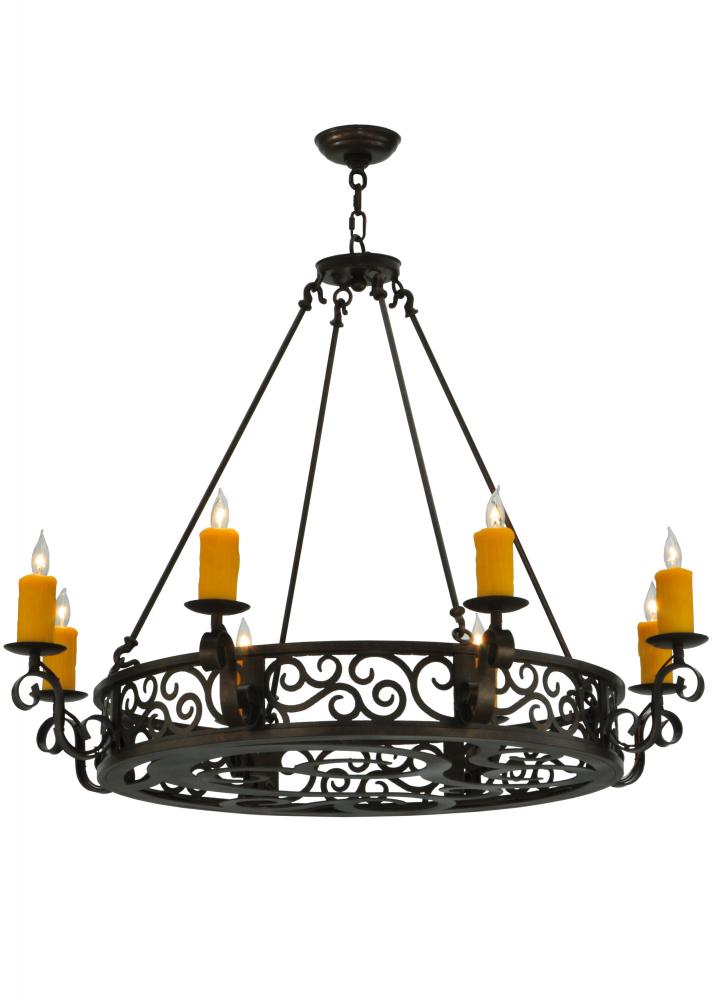 The Delano chandelier offers a lovely elegant style. This chandelier is enhanced with decorative accents and hardware featured in a stunning Gilded Tobacco finish. The fixture integrates sparkling illumination emanating from eight Amber faux candlelights perched on bobeches embraced by Hand-Forged Iron Scroll styled arms. The overall height ranges from 42 to 210 inches as the chain length can be easily adjusted in the field to accommodate your specific lighting application needs. Handcrafted by highly skilled artisans in our 180,000 square manufacturing facility in Yorkville, New York. Custom diffuser styles, metal finishes and fixtures sizes can be customized to meet your needs. UL and cUL listed for damp and dry locations.