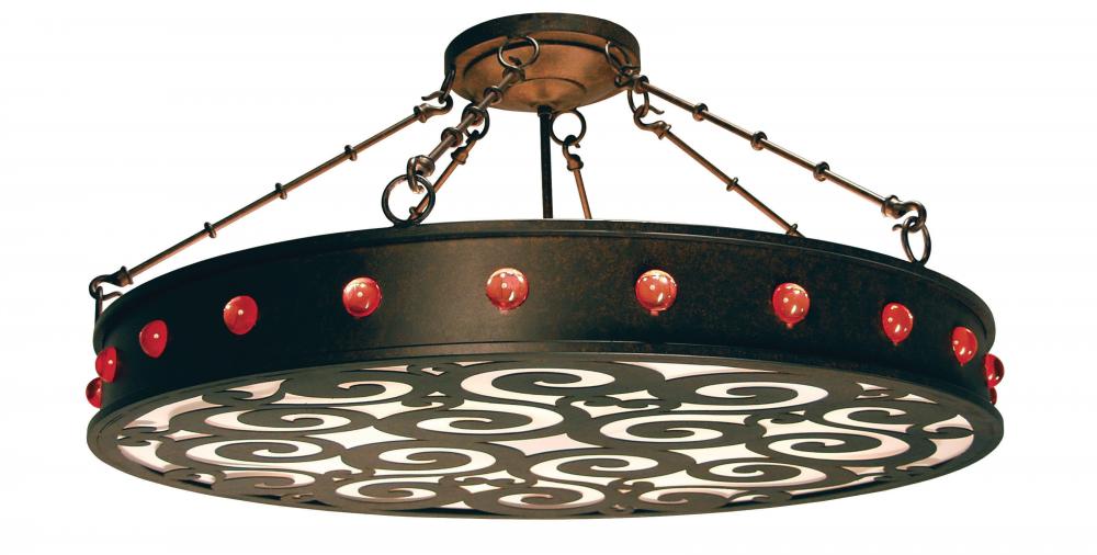 Jules is a Ceiling Light that offers a unique scrolled design where forms and accents illuminate brilliantly and are complemented with Ruby Red colored jewels around the perimeter. Embraced by the round steel frame in a Cajun Spice finish fits a Statuario Idalight diffuser for a soft, yet vibrant illumination. This fixture is intended for mounting in either singular or multiple clusters across ceilings. Handcrafted by highly skilled artisans in our manufacturing facility in Upstate New York, this transitional styled fixture is available in a wide range of custom choices including various designs, colors, sizes and dimmable energy efficient lamping options such as LED. The fixture is UL and cUL listed for damp and dry locations.