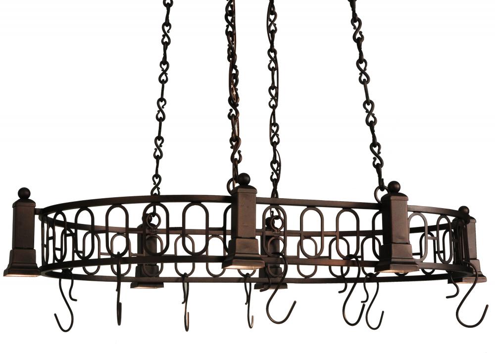 A handsome lighted pot rack design. This alluring ceiling fixture with oval-shaped repeat motifs and a curved shape is reminiscent of the Art Deco era. Revival Deco is highlighted with a Mahogany Bronze finished frame with hooks to display fine cookware or accessories for easy access in kitchens. Six customer-supplied G5 Bi-pin T4 Halogen downlights deliver functional lighting on surfaces below. The lighted pot rack includes Premium Chain with Hand-Forged Links. Chain length of 21"" to 88"" is easily adjusted upon request at our Yorkville, NY factory. Lamping styles, metal finishes and fixture sizes can be customized. UL and cUL listed for dry and damp locations.