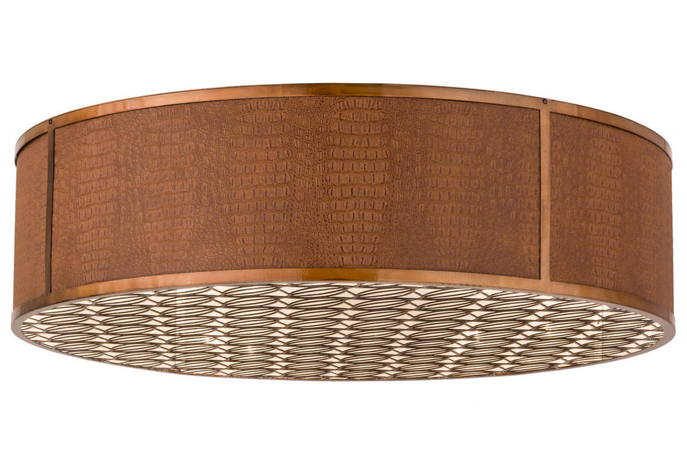 Designed with a stunning profile for various residential and commercial environments, this intriguing ceiling fixture design defines a distinctive sophisticated aesthetic. The unique Copper colored Alligator Skin-like diffuser is complemented with Transparent Copper trim and enhanced with a stylistically patterned grill on the bottom. Handcrafted in the USA, this fixture is available in custom colors, styles and sizes, as well as dimmable energy efficient lamping options such as LED. The flushmount is UL and cUL listed for damp and dry locations.