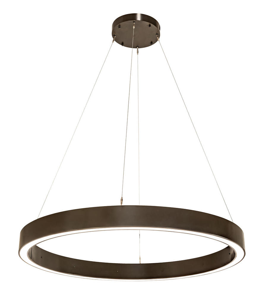 A modern sophisticated pendant featuring a spectral halo of ambient light that creates a stunning visual effect and breathtaking drama. Eliminating the power cord, our exclusive proprietary suspension system is engineered with low voltage spacecraft cables for balance, precision and a clean aesthetic. This Timeless Bronze finished solid ring reveals a Statuario Idalight diffuser. Integral LEDs deliver dimmable, robust illumination, energy savings, minimal maintenance and long life. The overall height of this pendant ranges from 16 to 76 inches as the spacecraft cable length can be easily adjusted in the field to accommodate your specific lighting application needs. Custom sizes, styles and finishes are available.