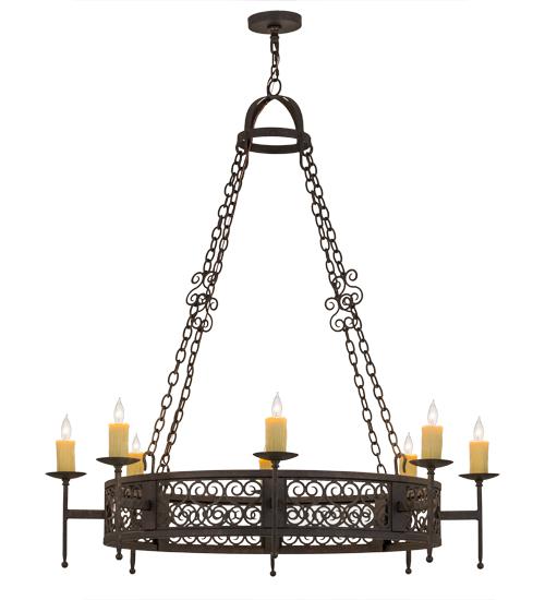 An elegant chandelier design comes to light with all of the sparkle and glamour of a regal castle, conjuring up images of romantic bygone days. Eight Ivory faux colored candlelights perched on bobeches with ballpoint accents are embraced by linear arms that are attached to a rotund frame underscored with a series of multi scroll motifs, one for each luminaire. The exquisite frame, hardware and hanging chain that supports this lovely fixture are featured in a Copper Rust finish. Handcrafted at our 180,000 square foot manufacturing facility in Yorkville, New York. Custom sizes, styles, colors and dimmable energy efficient lamping options are available. UL and cUL listed for damp and dry locations.