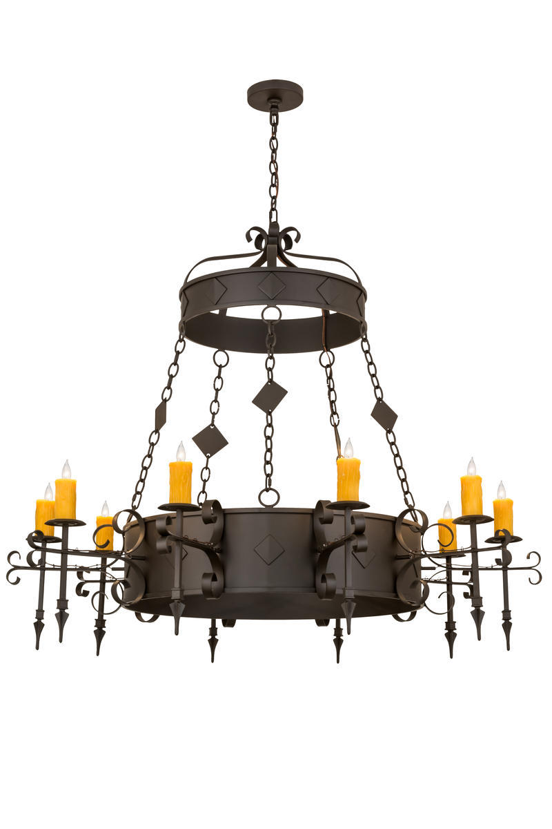 Welcome Gothic Revival into your home or business with the stunning Diamante Chandelier, which integrates a rustic motif with old world style. 10 Amber faux candles perched atop bobeches embraced by a single decorative ring provide ambient lighting that conjures up images of romanticized days of yore. Decorated with scroll accents, pointed tips and featured in an Oil Rubbed Bronze finish, it completes an evocative impression for a stunning custom wrought iron look. Custom crafted in Yorkville, New York our skilled artisans, this fixture is offered in in custom designs, sizes and finishes, as well as dimmable energy efficient lamping options such as LED.