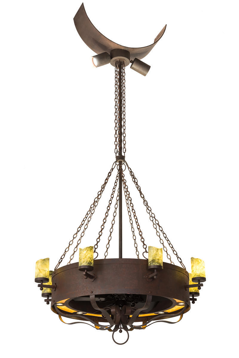The Parnella Chandel-Air combines custom lighting with energy-efficient fan technology. 8 Stunning White/Light Green Jadestone Cylindres are embraced by a Rusty Nail finished ring with arm. An Amber Mica bottom diffuser complements the fixture. A custom sized yoke was created to accommodate a log home ceiling. Any fixture can be customized to mount in any space. 8 Customer supplied medium base inner lights bring out the beauty of Jadestone, 16 Customer supplied inner lights and Integral LEDs highlight Mica, & 8 Customer supplied uplights provide ambient lighting, for layered lighting. Handcrafted in Yorkville, NY. Pulls hot air up & keeps the space cool in summer, and reversed in the winter to push down hot air and maintain warmth.