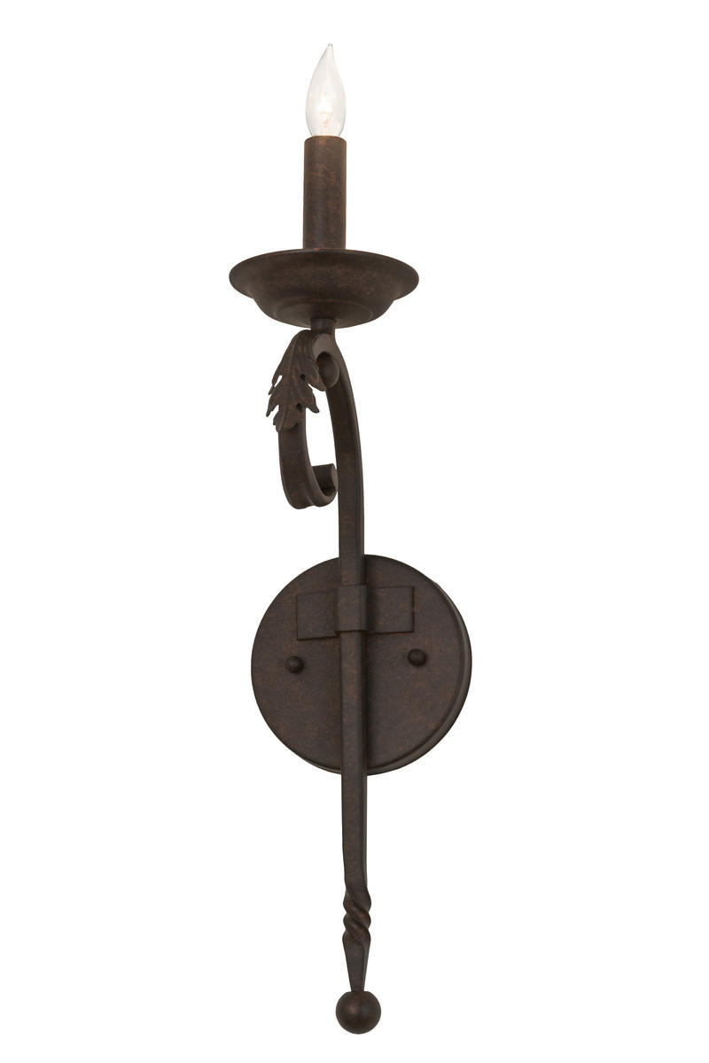 Rich, handsome styling greets a distinctive sophisticated look. A faux candlelight is perched atop of a custom tailored bobeche, which is accented with a curved decorative stem embellished with an Acanthus leaf and ball point accent for a high level of aesthetic appeal. Stunning Solid Steel hardware is hand forged and hand finished in a Cajun Spice hue. Ideal for hallways, foyers and other spaces in homes, restaurants, pubs, hotels and other fine interiors. Custom crafted by highly skilled artisans in our 180,000 square foot manufacturing facility in Yorkville, New York. This fixture is available in custom sizes, styles, colors and energy-efficient lamping options. UL and cUL listed for damp and dry locations.