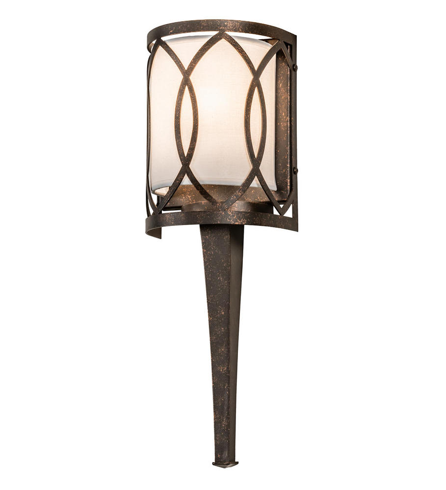 This stunning fixture with a chic curved design features an Art Deco motif. The Cream Textrene diffuser is complemented with a Gilded Tobacco finish. This ADA Compliant wall sconce is handcrafted by highly skilled artisans in our 180,000 square foot manufacturing facility in Yorkville, New York. Shade styles, metal finishes and sconce sizes can be customized. UL and cUL listed for dry and damp locations however we do not recommend installing it in spaces that experience moisture due to the fabric shade.