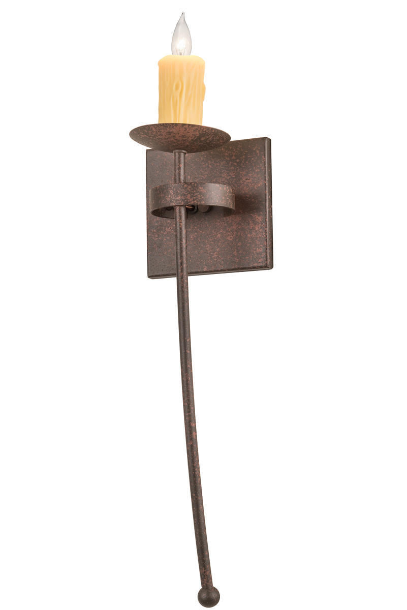 Handsome styling greets a distinctive sophisticated look. An Ivory faux candlelight is perched atop of a custom tailored bobeche accented with a long slender decorative stem embellished with a ball tip for a high level of aesthetic appeal. An appealing square backplate is complemented with a curved band. Stunning solid hardware is hand forged and hand finished in a Rusty Nail hue. Ideal for hallways, foyers and other spaces in homes, restaurants, pubs, hotels and other fine interiors. The fixture is custom crafted by artisans in our 180,000 square foot manufacturing facility in Yorkville, New York. UL & cUL listed for dry and damp locations.