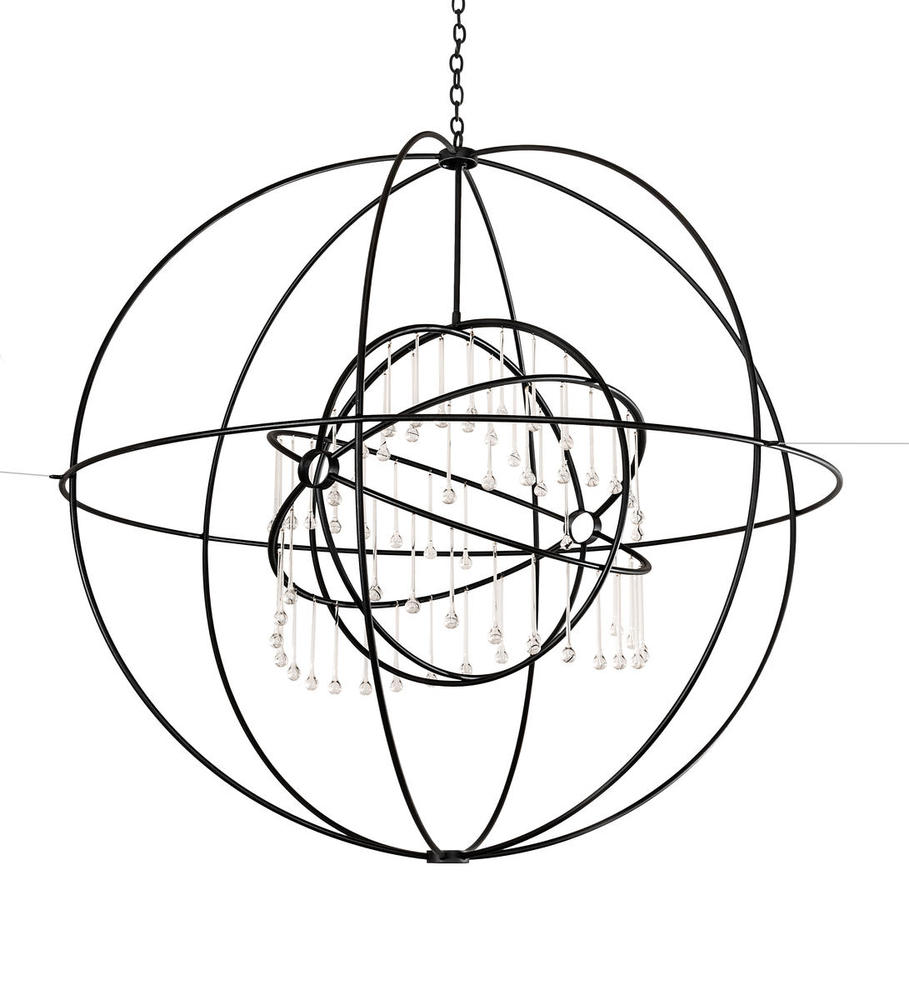 Like a complex gyroscopic structure. Solid metal rings create a unique curvature pattern that evokes the illusion of revolutionary motion like a spinning gimbal rotating on its axis. The orbed frame envelopes a smaller frame similar to one that represents atomic energy. This indoor/outdoor decorative sculpture features a Textured Black finish treated for exterior applications. The sculpture is adorned with exquisite Crystal teardrop accents. The overall height ranges from 67 to 186 inches as the chain length can be easily adjusted in the field to accommodate your specific lighting needs. Crystal options, metal finishes and fixture sizes can be customized to your needs. This fixture does not illuminate but various lamping can be added to light as a chandelier.